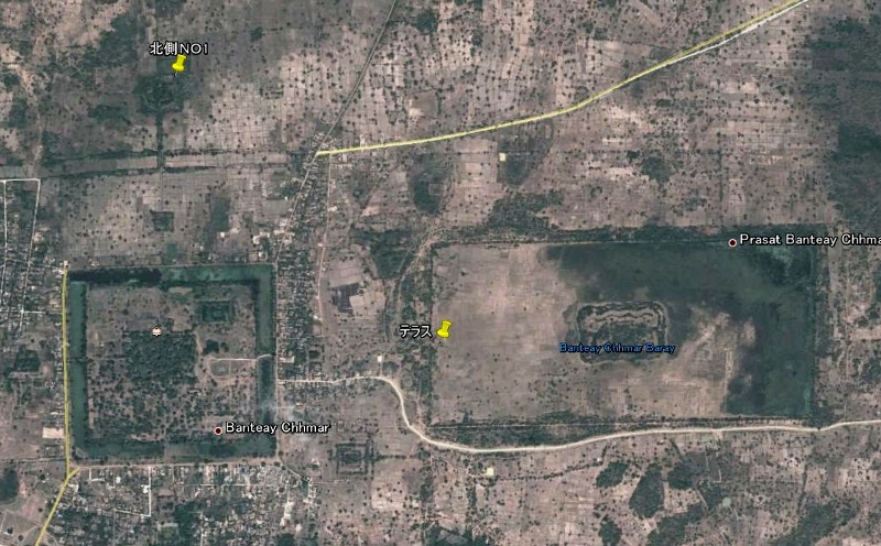 カンボジア バンテアイ メアン チェイ州 バンテアイ チュマールの航空写真 写真の中にバライが見られます「右側」 このバライがクメールの中で 状態が良いのでは バライで 最も多く紹介される西バライはフランスとアメリカが一部に手を居れ 当初のものからかなり改良され オリジナル性が失われている 特にアメリカが1958年にバライ内部に人々が住み バライ内部で米作りを行われていましたが 内部に水を蓄え 更に水門 排水路を建設され オリジナル性は失われたバライです その点 バンテアイ チュマールのバライは 写真 左側から環壕に囲まれた中にバンテアイ チュマールがあり 寺院の東側にバライがあります これはバライの80%が寺院の東側にある 更にバライの中央にメボンがあり そのメボンで 宗教儀式を行ったと思える施設があります まあ もう少し詳しくバライを見ていきましょう 「グーグル アース使用」 |