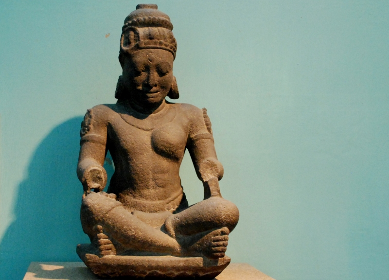 NO3 クメール像としては 珍しいタイプの石像です それは坐像の形と 宝冠は他では 見られません 説明に9世紀と記載 |