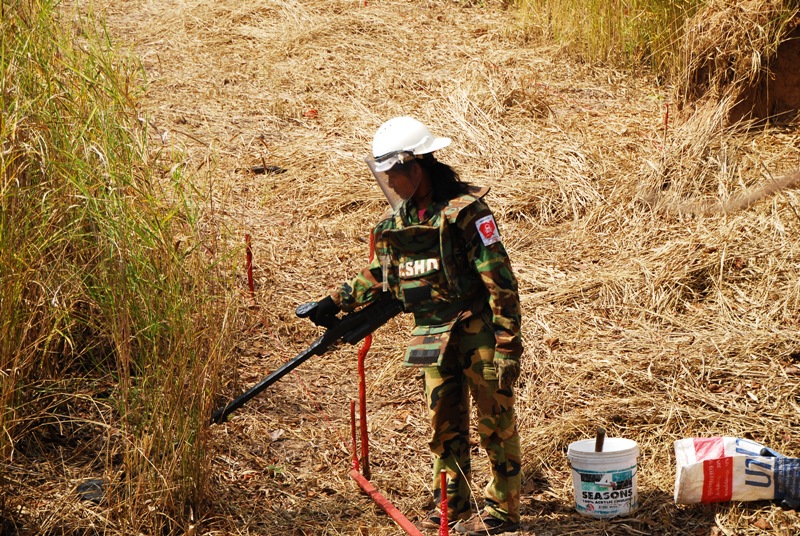 地雷除去の 作業を行う 数少ない 女性の 隊員 右手に黒い棒 地雷探索機 のフラット面に 当てて バッテリー チックを バッテリーが 正常に あるなら 音がします |