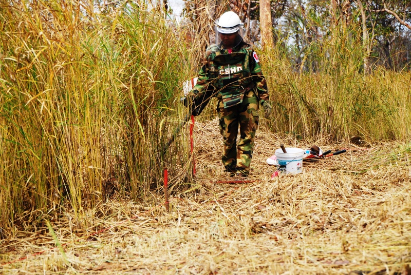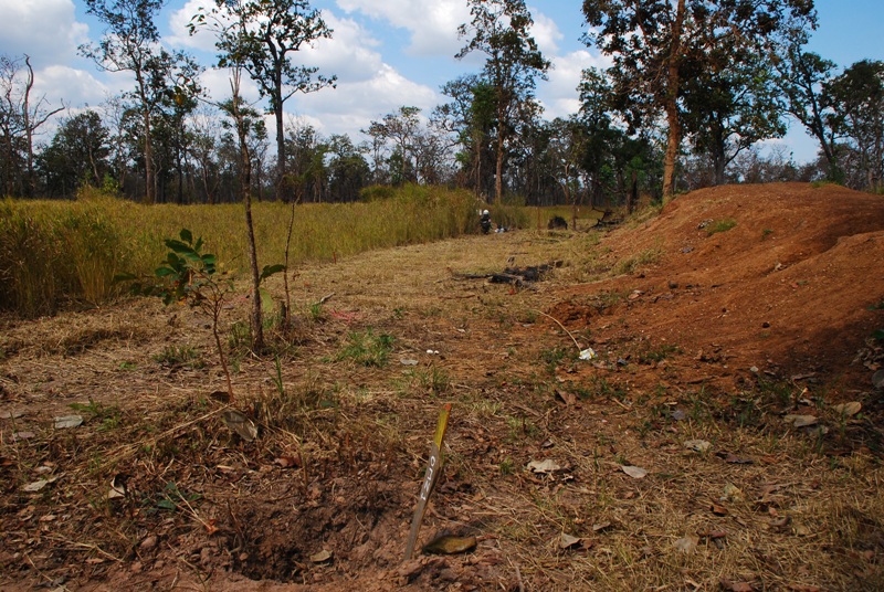 写真のしたに穴が 彼女が 2日前 地雷を見つけ 地点 写真の上 小さく彼女が 探索作業を 2日間で 草のない ところ この部分 地雷探索が 終えたのですね |