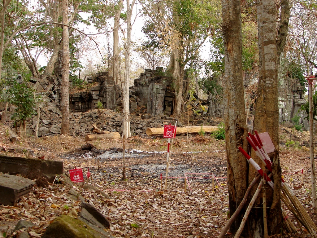 参考 大プリア カーン 南門 付近 地雷 探索中 「2007年のこと」 ポルポトは周壁の前を 地雷を埋め 周壁の中で 安らかな眠りを 困ったもんです |