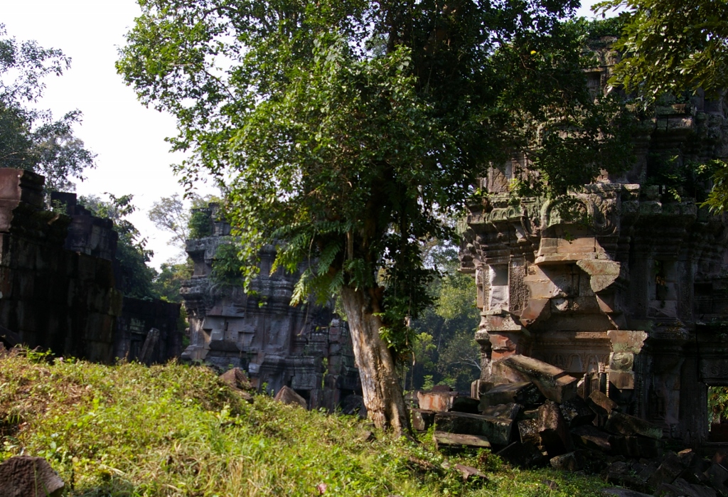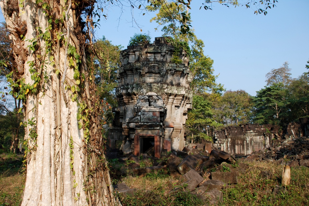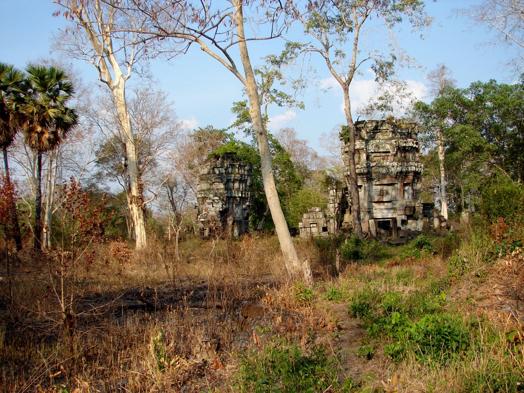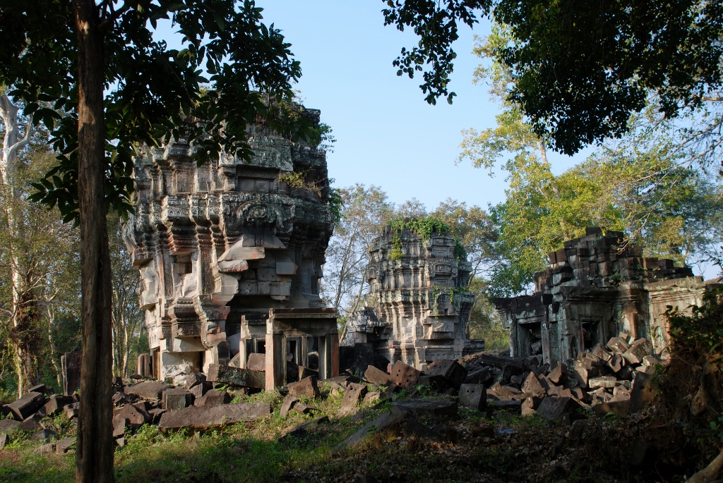 | クメールで 最もひどい盗掘跡から紹介します 大プリア カーン 祠堂 この画像に三基の建物が描かれていますが 左側と中央に高い建物が この2基の建物が盗掘がひどく 右の低い建物も盗掘跡があります |