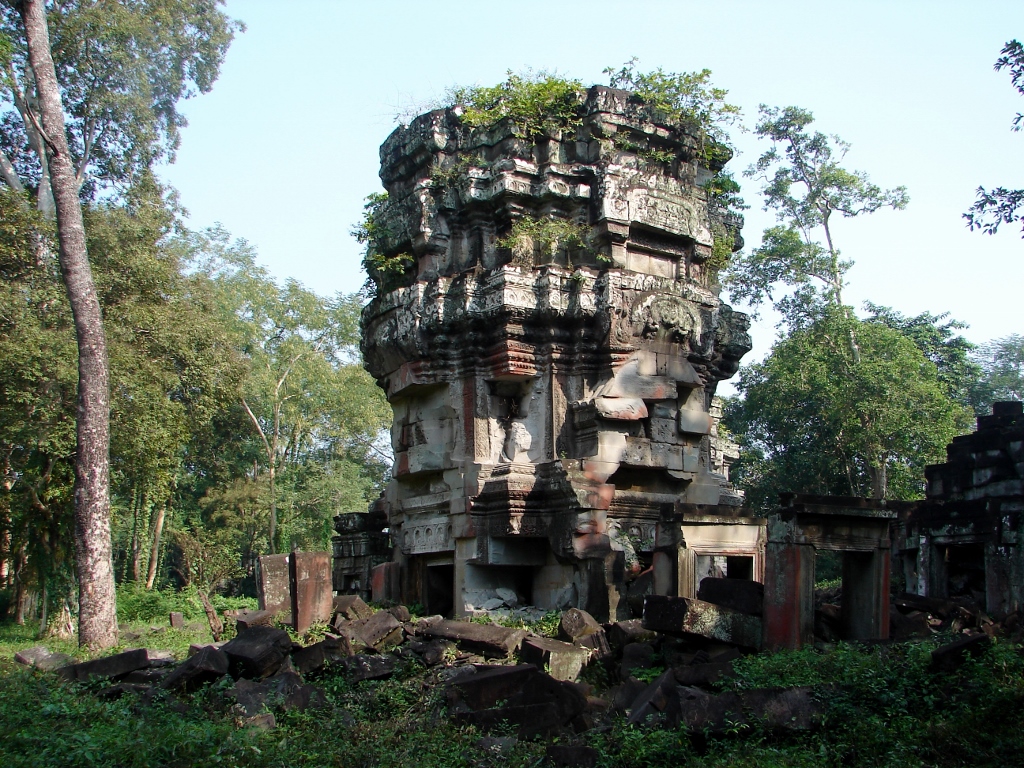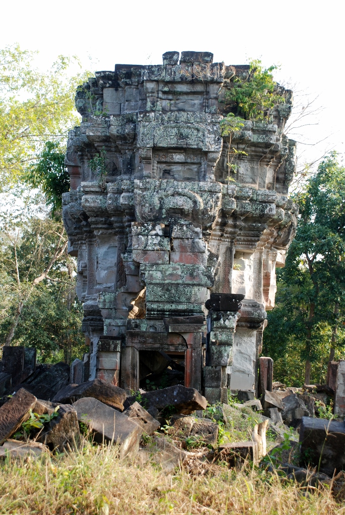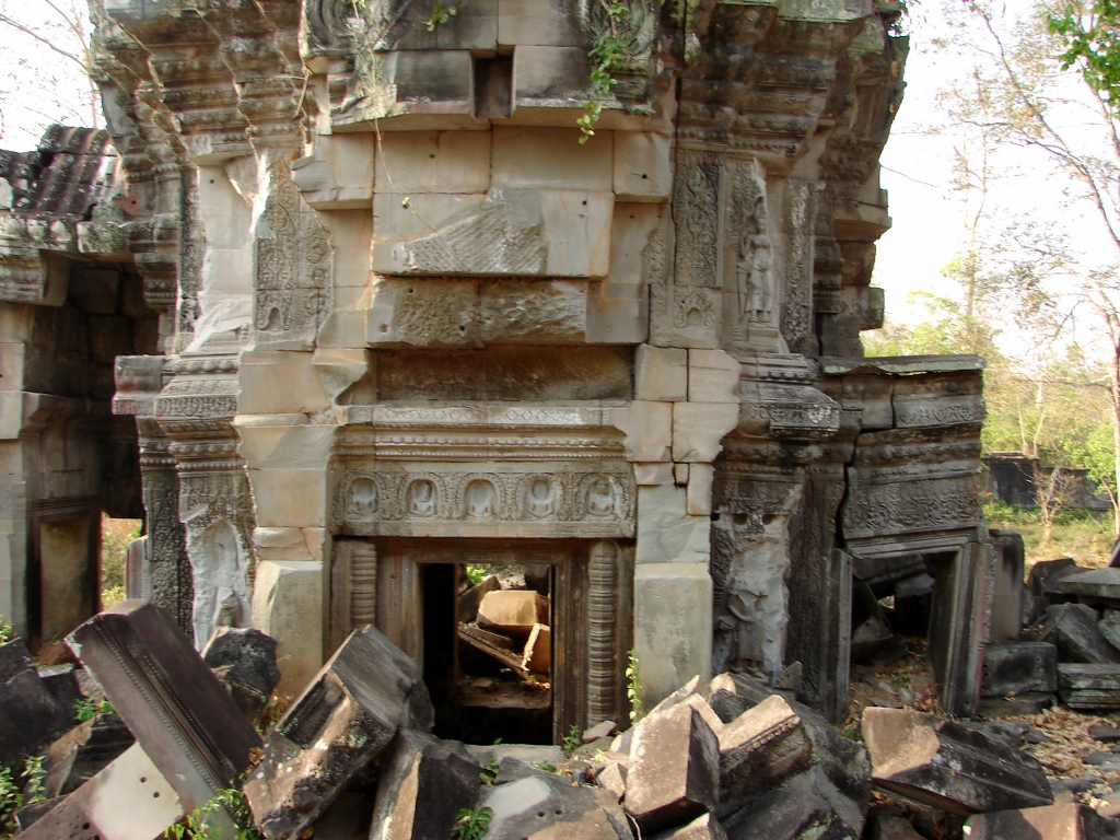 祠堂をアップすると 剥離面が 酷い 何度も話していますが デヴァター リンテルは建材に描かれ 建材に使用されたいる砂岩は 幅1M 長さ2Mほどの砂岩が使用されています その砂岩から 剥ぎ取るので 大変な能力を しかし クメールの盗掘で この様にひどい盗掘場は 2ケ所のみと 少ない |