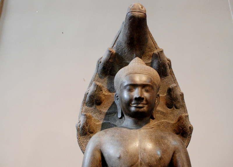NO6 カンボジア博物館展示 バプーオン様式の石像 光背にナーガが 描かれています クメールの像でナーガが 描かれえるのは 破風飾りと同じく 11世紀から多くなります |