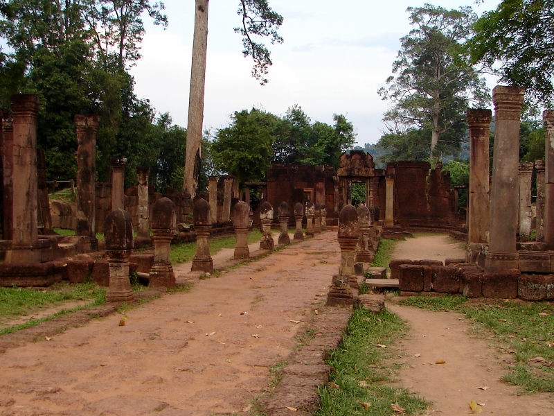 NO4 最初の東塔門をくぐり 左右にリンガ塔がある参道 リンガはクメールで初めから 祭られています このリンガ塔は このバンテアイ スレイから初めて 置かれ 以後 バイヨン様式の寺院まで 使用され 年代の判断に参考になります |