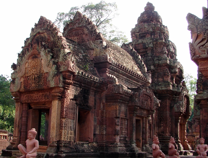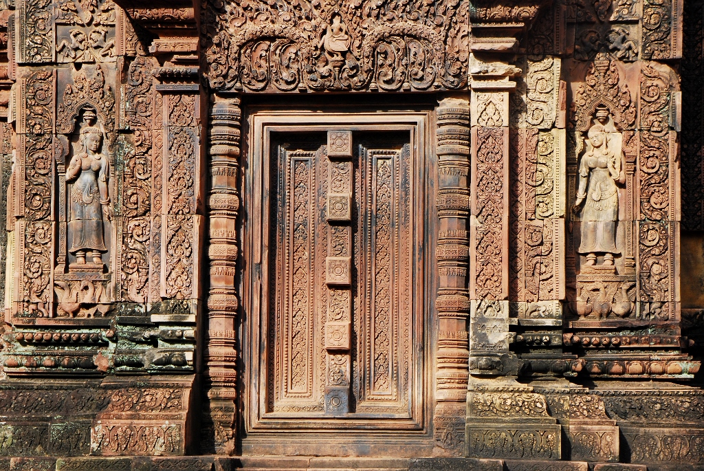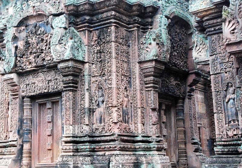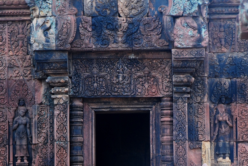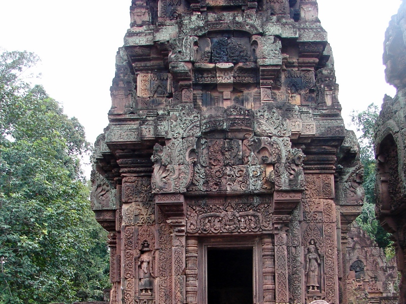 南側の祠堂を西側から見る 左右に デヴァター 中央にリンテルと偽扉 リンテルを支えるコロネット 祠堂の側面 すべて彫刻が施されている クメール寺院では これほど多くの彫刻がされた寺院は他には見られません |