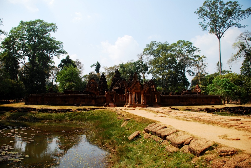 NO5 参道 環濠の先にバンテアイ スレイ 前方に見える ラテライト造りの 周壁は 東西 44M 南北 40Mと それほど大きな寺院ではありません |