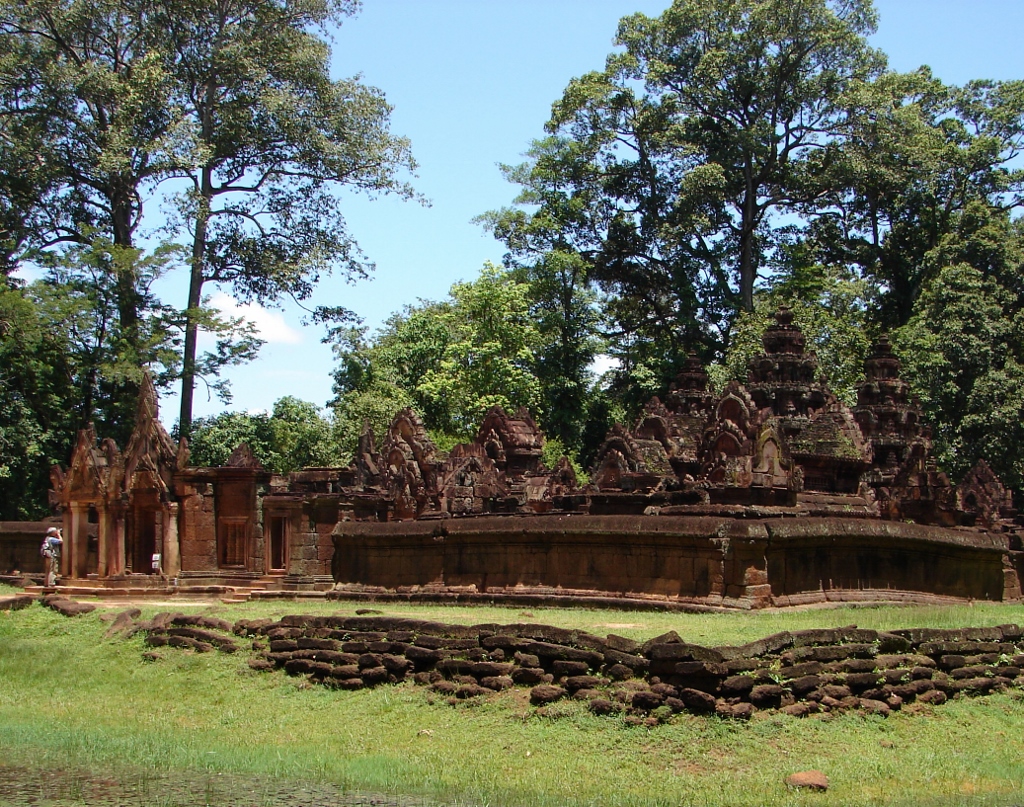 バンテアイ スレイ 右側の三基の塔 祠堂です 画像の中央に二基の経蔵 手前にラテライトの周壁と環濠の縁に積まれたラテライト |