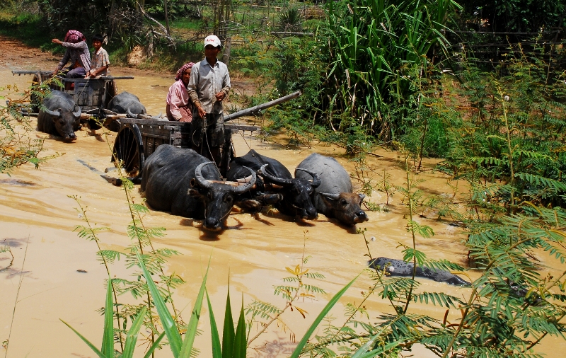 | 水にも強く 悪路にも強い牛 しかし トラクターと比べ 力 スピードは カンボジアの田舎では まだ 寺院めぐりで この牛車と コブタは利用価値の高いものですが 乗り心地は今ひとつですが |