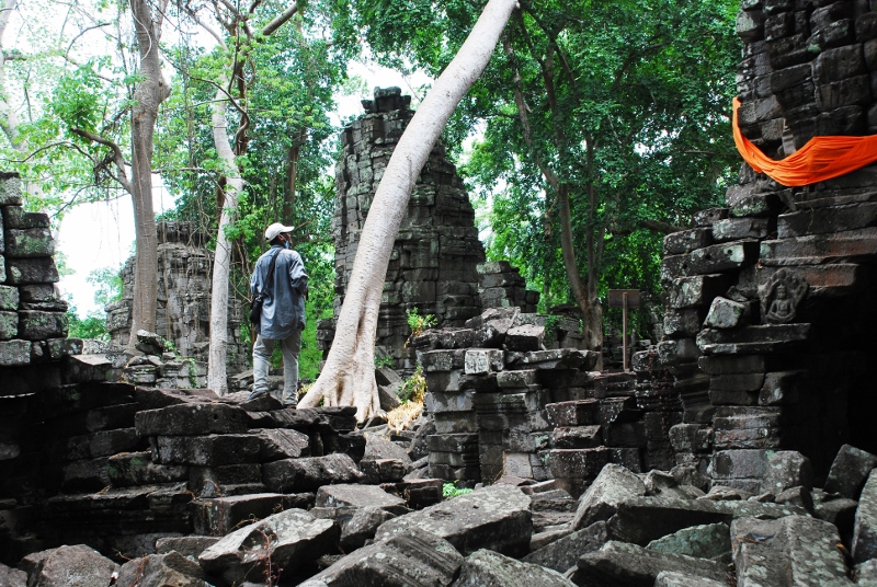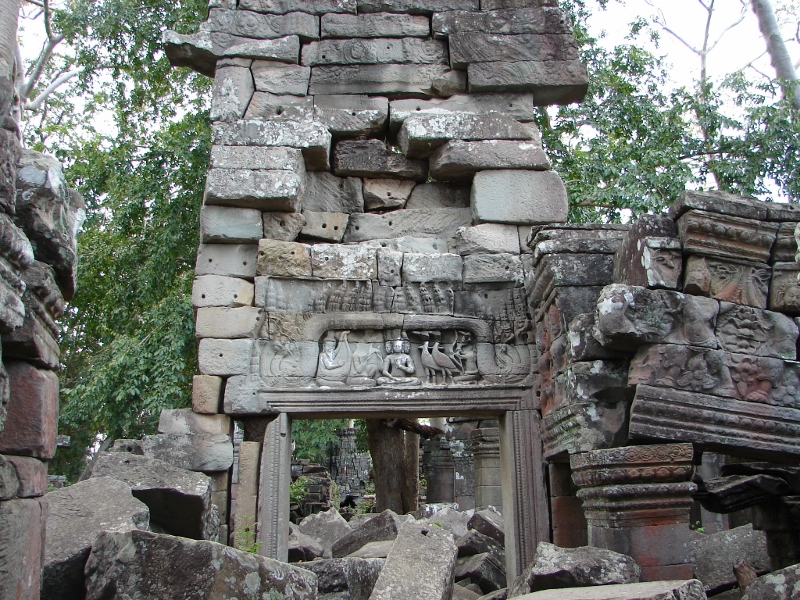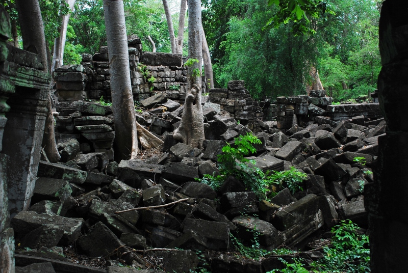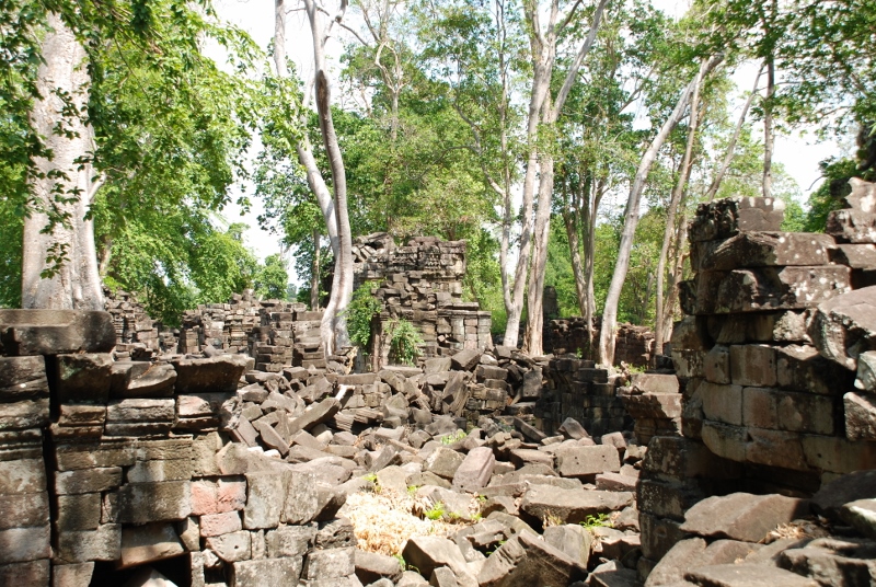 バンテイア チュマール 回廊の上から画像を写す 中央の祠堂も半分は崩壊 その付近に砂岩が散乱 |