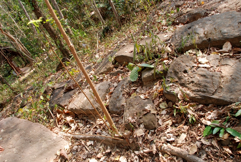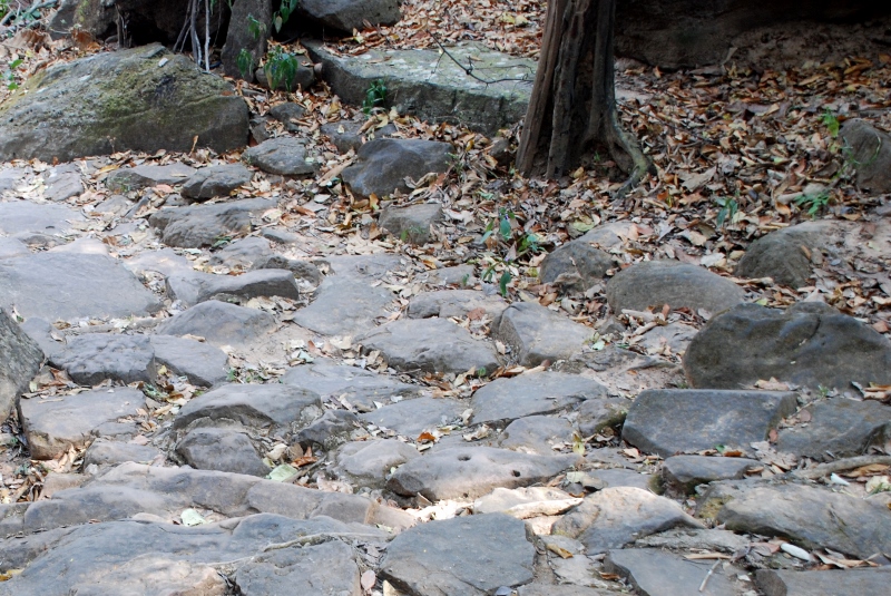 NO1 タイ国 サコン ナコーン県 Prasat Phra That Phu Phek 約 海抜500Mのところにある 山岳寺院の未完成 海抜200M付近に 砂岩採掘現場があります 参道 画像上のやや大きい石 ここから奥側が採掘現場 手前は寺院に登る参道 参道の小さな砂岩に 穴 二つ |