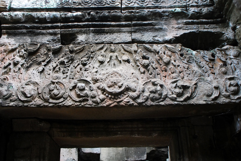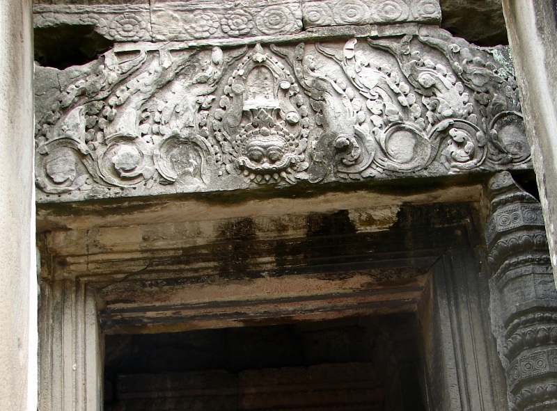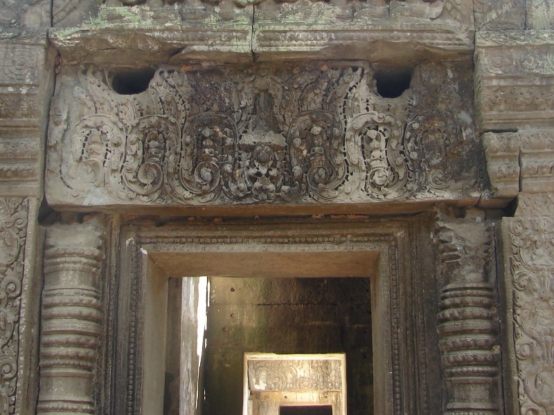 NO1 シムリアップ州 アンコ−ル ワット遺跡群 バイヨン様式 リンテルに二つの穴? これは鉄製のチギリを 盗掘するためにあけられた 穴です |