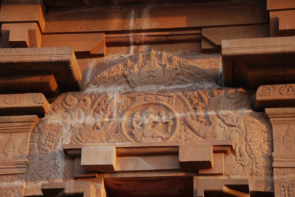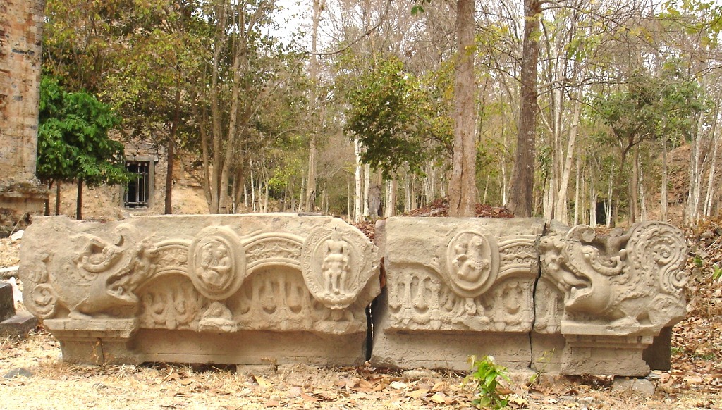 NO6 クメ−ルでは 7世紀 サンポ−ル プレイ クック様式の 多くのリンテルは マカラ 口からベルト メダルと インドからのリンテルを コ−ピ−しているが 7世紀の後半 は マカラは描かれなくなります サンポ−ル プレイ クック遺跡に 安置されたリンテル サンポ−ルプレイ クック様式 7世紀 クメ−ルの寺院 |