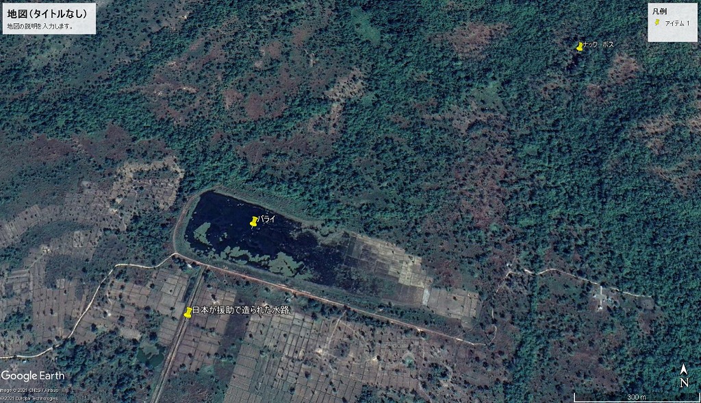 NO8 グ−グル ア−スから見た ナック ボス バライがあり 日本の援助で 排水路が造られ 農耕に援助を バライ クメール その水を利用して 農耕を 100以上のバライを見て 答えは 寺院の多くは現地の農民に 依頼して行っていますが 現地の農民は 誰も バライは 何のため造られたか 知りません このバライ 山に傾斜を利用して 田畑に水を送る最適地 しかし 排水路は日本が |