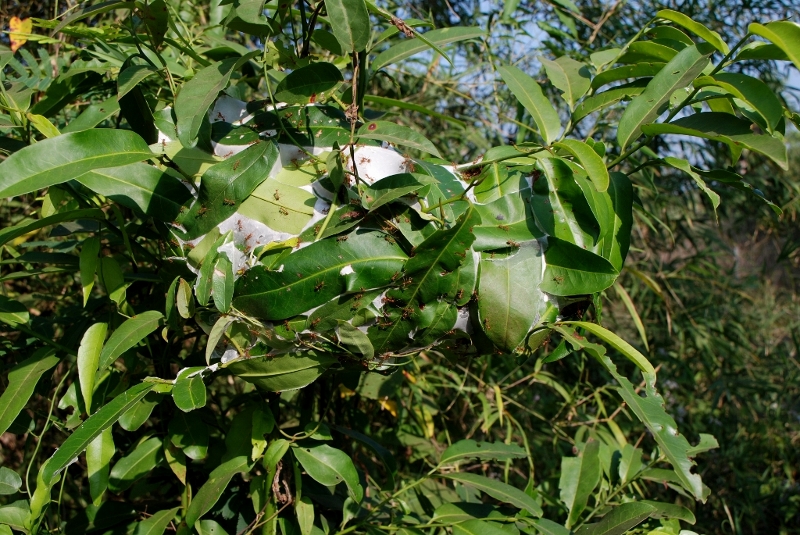 NO6 藪の中 青い葉の塊 そう 赤蟻の巣です まあ 良くこれに当たりると あの強烈に噛み付く蟻 5−6匹は体に付着して 足 又は 腕を噛みつくでしょう |