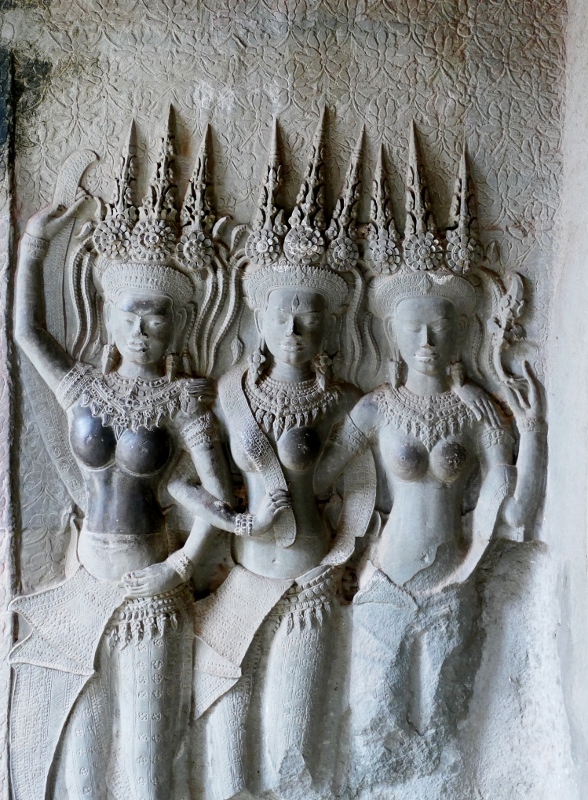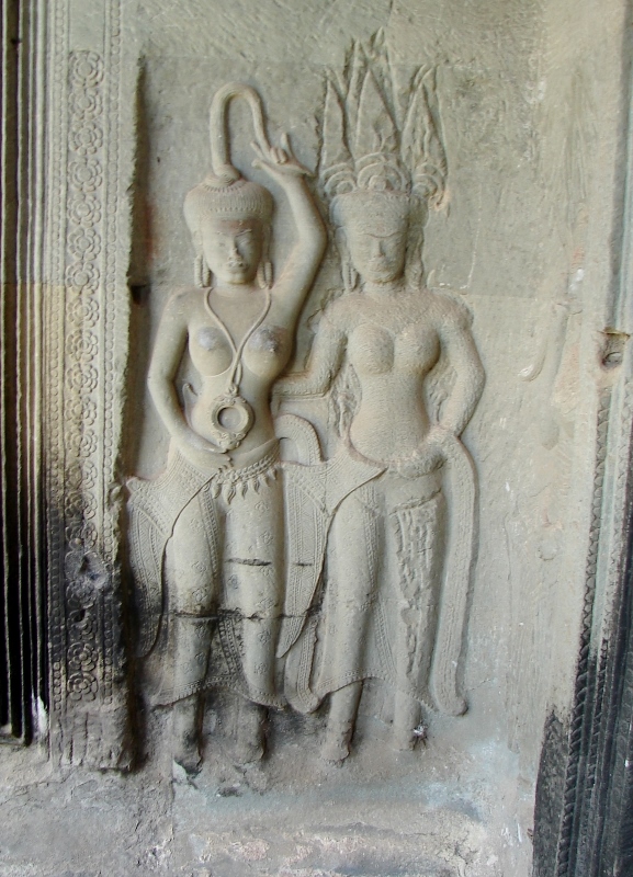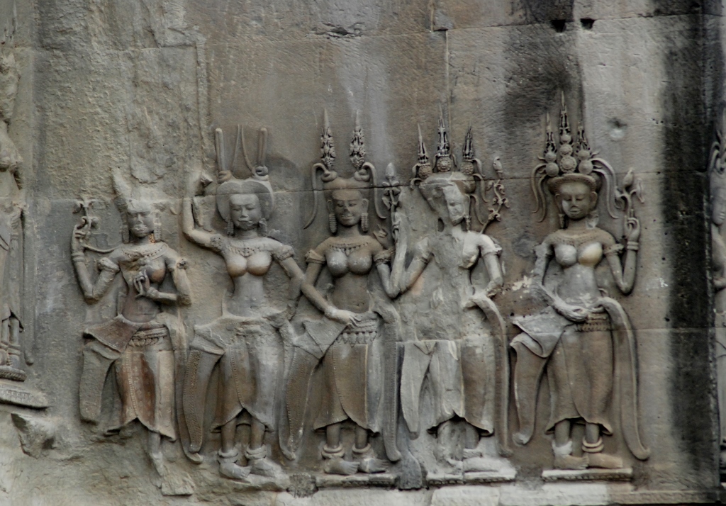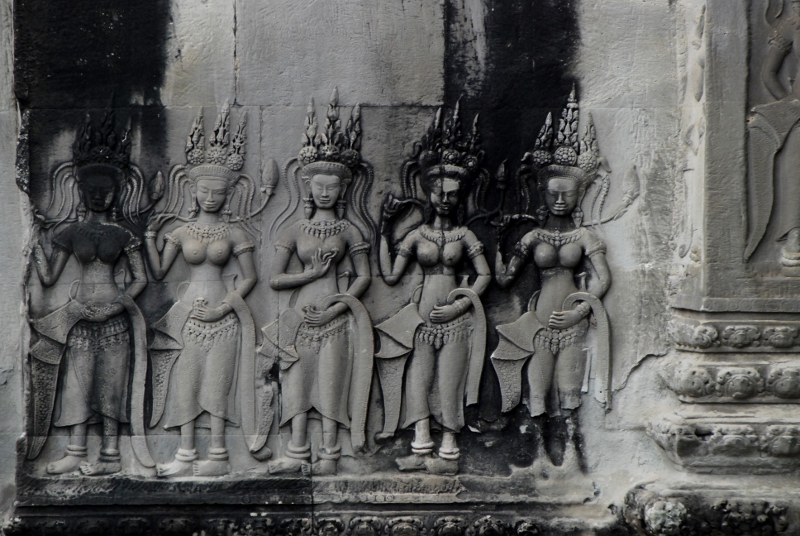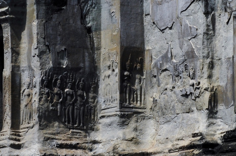 NO1 シエムリアップ州 アンコール ワット 「アンコールワット様式 12世紀」 左に4体のデヴァター 右に2体のデヴァター その中間に上から白い所が水が流れ落ちた所 左右のデヴァターは 水のダメージを 特に足 付近のダメージが多い 水が残っていたため? 「黒し壁 白い水路跡」 |