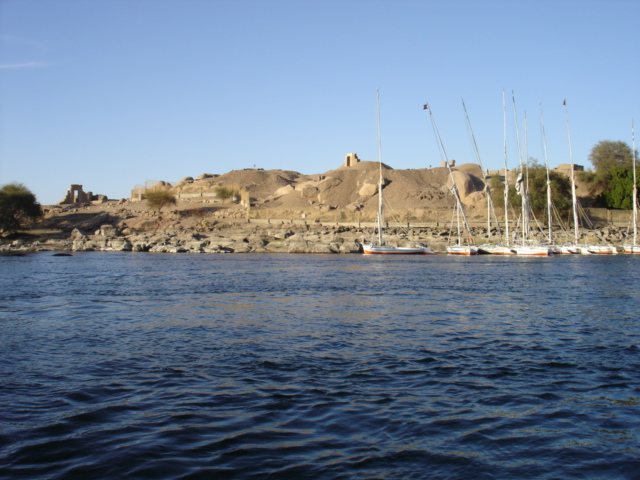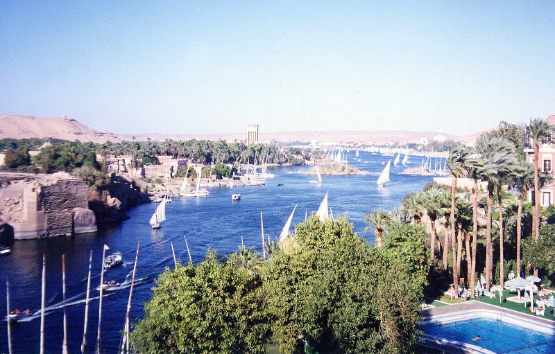 NO2 アスワンに有る ホテルからナイル川を見る 川に浮かぶ船 帆を上げると 風が船を上流に運び 北風が1年中あるとか 帆を下げると 水の 流れが船を下流に とても自然に恵まれた ナイル ところで シエムリアップ河は |