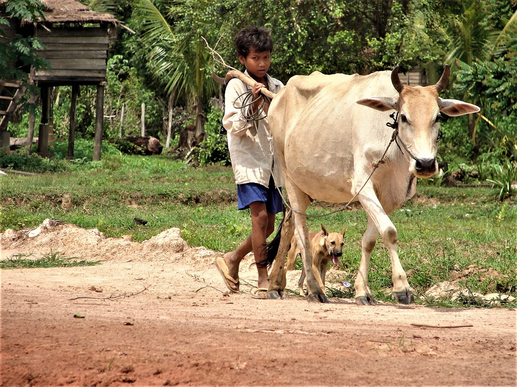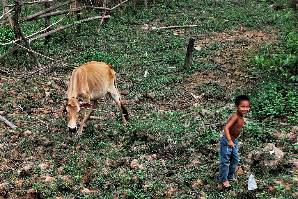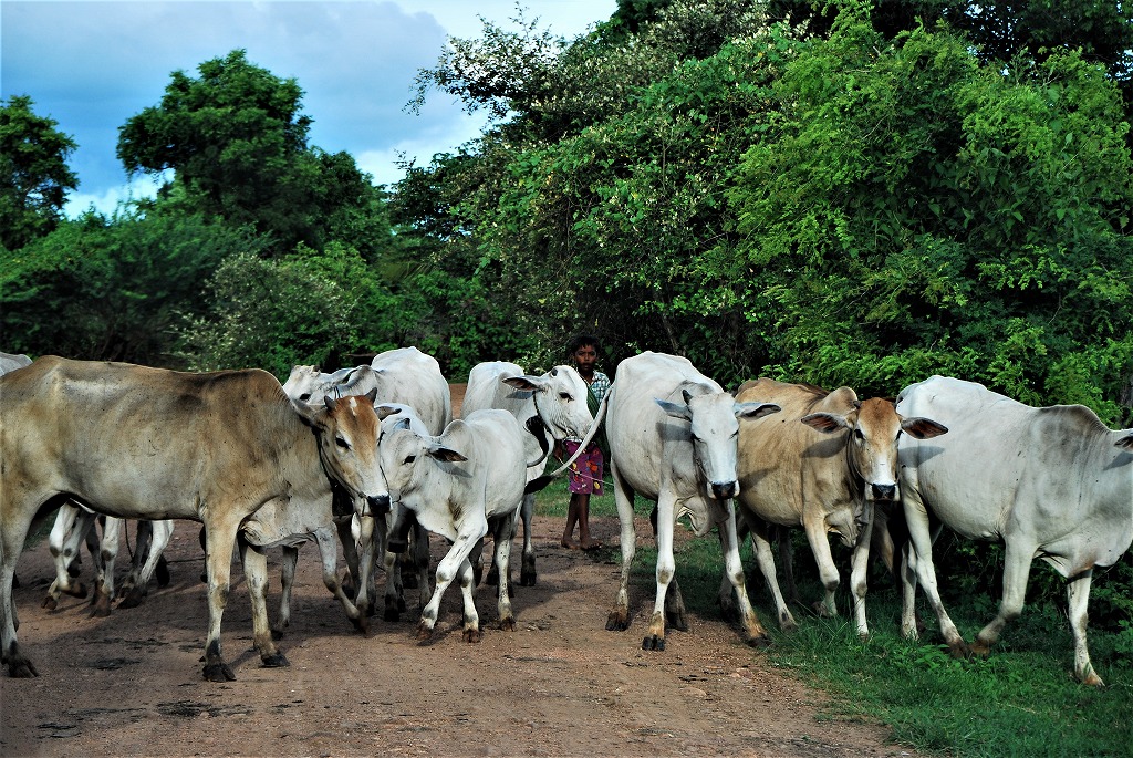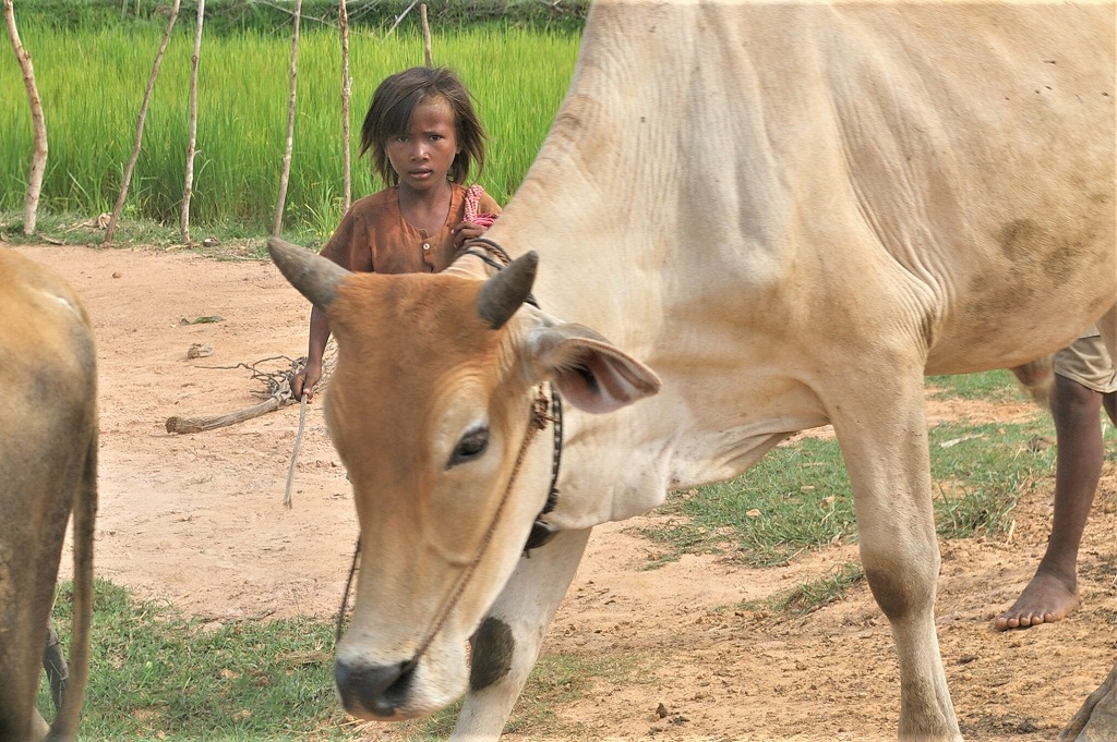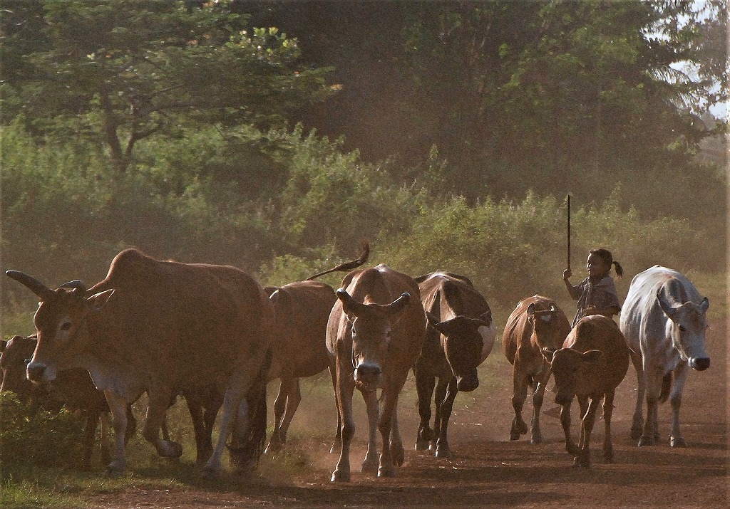 NO1 小さな子供が 片手に 棒を 牛の誘導に 使用する棒 こんな小さな女の子 牛を餌場に 誘導を |